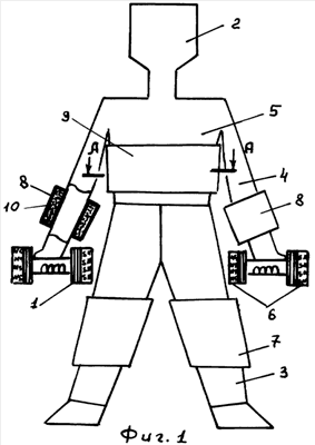 Сущность изобретения поясняется чертежами, где схематично на фиг.1 изображен человек в процессе выполнения физических нагрузок, снабженный устройством для одновременного магнитотерапевтического воздействия на организм; на фиг.2 – разрез по А-А на фиг.1 по упругому рукаву на туловище человека.