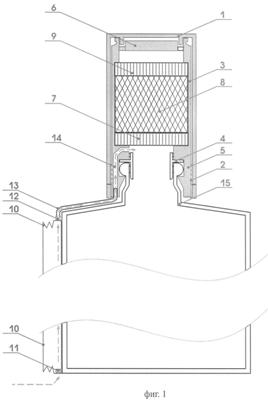 Закупоренная бутылка с водкой берется в руки, открывается путем свинчивания декоративного колпачка 1 и перевертывается горлышком вниз над сосудом для налива. Водка, содержащаяся в бутылке, переливается через отверстие в герметизирующем элементе 4 к фильтрующему материалу грубой очистки 7, часть ее под действием гравитационных сил проходит через него и попадает в полость корпуса картриджа, заполненную сорбентом 8 или их смесью, обеспечивающими заданную степень обработки водки. Пройдя через сорбент 8, водка не сможет преодолеть фильтрующий материал тонкой очистки 9 только за счет гравитационных сил из-за уменьшения давления воздуха во внутреннем объеме бутылки 15 вследствие его разрежения и большого суммарного сопротивления фильтрующих материалов 7 и 9 и сорбента 8. Для того чтобы продавить водку через фильтрующие материалы и сорбент, потребитель нажимает на пружинистую емкость воздушного насоса, которая в исходном состоянии имеет больший объем. Впускной клапан 11 под действием давления внутри емкости воздушного насоса закрывается, а выпускной клапан 12 открывается, в результате чего воздух из насоса через трубку 13, воздухоподающий канал 14 в корпусе картриджа и отверстие в герметизирующем элементе подается во внутреннюю полость бутылки. Последовательное нажатие на емкость воздушного насоса продолжается до тех пор, пока давление внутри бутылки не достигнет величины, достаточной для продавливания водки через фильтровальные материалы и сорбент и обеспечения нужной скорости ее вытекания из емкости. При наполнении наливаемой емкости, обработанной водкой, потребитель прекращает нажатие на емкость воздушного насоса и переворачивает бутылку горлышком вверх. Избыточное давление воздуха в бутылке выталкивает часть водки из емкости, заполненной сорбентом, через фильтрующий материал 9 в полость корпуса картриджа над ним, ограниченную рассекателем-ограничителем 6, а остаточное давление сбрасывается через каналы для протока водки в рассекателе-ограничителе картриджа в окружающее пространство. Конфигурация рассекателя- ограничителя картриджа обеспечивает устранение возникающих при сбросе давления брызг водки. Выпускной клапан закрывается, перекрывая доступ воздуха в бутылку. Декоративный запорный колпачок навинчивается на корпус картриджа с помощью резьбового соединения и герметично закупоривает бутылку. Остаток водки из картриджа под действием гравитационных сил постепенно перетекает обратно в бутылку. При необходимости операция повторяется.