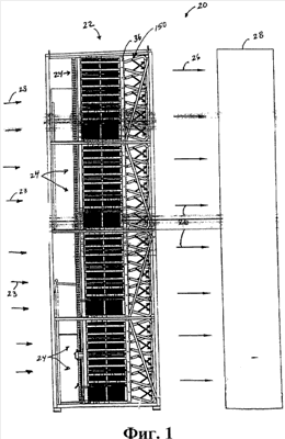 На фигуре 3 представлено перспективное изображение, с частичным разрезом, воздухозаборника 22, показанного на фигурах 1 и 2. На фигуре 3 показана рама 30, которая служит в качестве опоры трубной доски 36, и газовый фильтр 24. При рассмотрении фигур 1-3 можно видеть, что рама 30 может быть изготовлена в соответствии с желательными расчетными параметрами. Как правило, рама 30 состоит из множества поперечин, опорных балок и других структурных компонентов.