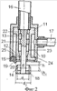 В качестве распылителя используется акустическая форсунка (фиг.2), содержащая корпус 10 с размещенным внутри генератором звуковых колебаний ультразвукового частотного диапазона в виде сопла 12 и кольцевого объемного резонатора 14. Корпус 10 выполнен в виде вертикально расположенной цилиндрической втулки, в верхней части которой расположена трубка 16 для подвода воздуха, а перпендикулярно ее оси расположена трубка 17 для подвода жидкости. Внутри корпуса 10 соосно ему жестко закреплена втулка 23 с верхним 11 и нижним 15 фланцами, причем нижний фланец 15 жестко зафиксирован в проточке, выполненной в корпусе 10.