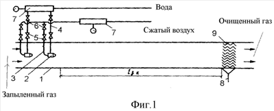 Система газопылеочистки воздушных выбросов (фиг.1) содержит расположенный горизонтально корпус 1 цилиндрической формы с зоной контакта длиной 1 зк в центральной части, слева от которой последовательно по оси корпуса расположены, по меньшей мере, две акустические форсунки 2. В правой части корпуса после зоны контакта длиной 1 зк расположен каплеуловитель 9 со сливом 8 в нижней части корпуса. К каждой акустической форсунке 2 подведены патрубки 3 для сжатого воздуха и патрубки 4 для воды с запорными 5 и регулирующими 6 вентилями, связывающими патрубки 3 и 4 с коллекторами 7, соответственно расположенными в трубопроводах, подводящих воду и сжатый воздух. Каждый из коллекторов 7 оснащен манометрами для контроля давления воды и сжатого воздуха.