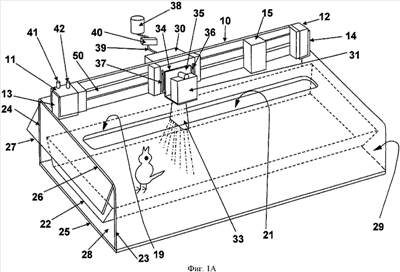 Возвратно-поступательные проходы распылительной головки вдоль удлиненного направляющего рельса можно повторять с целью обеспечения желаемых доз жидкости. Однако возможно также вдыхание обрабатываемыми птицами капель жидкости в дыхательные пути или глотание жидкости посредством орального контакта с каплями жидкости, которые оседают на перьях. Трение, встряхивание и физический контакт между птицами также распределяют жидкость на большинство, если не на всех птиц. После выполнения желаемого опрыскивания контейнера можно отключать подачу потока сжатой жидкости в распылительную насадку, удалять открытый сверху контейнер из-под крышки, заменять новым контейнером с цыплятами и повторять процедуру. Поэтому можно быстро и равномерно приводить большое количество птиц или цыплят в контакт с жидкостью при минимальной обработке птиц.