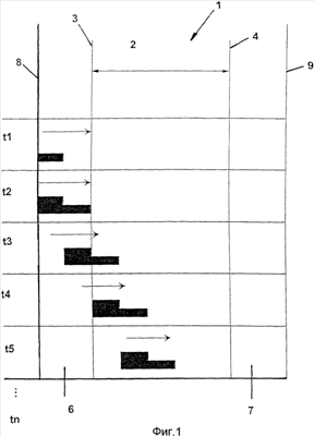 В показанном примере сначала открывается левая форсунка D1 форсуночной балки 10 (см. фиг.2) во время t1. После истечения заданного промежутка времени во время t2 дополнительно открывается форсунка D2, расположенная справа рядом с форсункой D1. После еще одного промежутка времени в момент t3 отключается форсунка D1 и открывается следующая форсунка D3. Этот процесс повторяется до тех пор, пока не будет достигнут правый край бочки 9 рабочего валка 5. Следующий интервал по очистке может осуществляться непосредственно после этого, а именно происходит открывание форсунки D1, а затем следом форсунки D2.