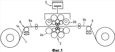 Согласно фиг.1, полосы 1 из нержавеющей стали или фольга 1а из нержавеющей стали в многовалковой клети 2, двадцативалковой клети 2а Сендцимира, прокатываются посредством размотки, прокатки и смотки. При этом комплекты 2b валков образуют сплит-блок. Верхний комплект 2b валков может регулироваться посредством установочного элемента 3 и других элементов. В контуре 4 регулирования (фиг.6-9) вырабатываются описываемые сигналы. Эти сигналы формируются перед процессом прокатки на входе 5а и после процесса прокатки на выходе 5b посредством элементов 6 для измерения плоскостности, которые в показанном примере выполнены в виде измерительных роликов 6а.