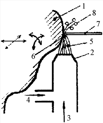 1. Криогенно-эрозионный способ упрочнения поверхностного слоя заготовки, включающий обработку заготовки в среде жидких газов электродом-инструментом из упрочняющего материала, который устанавливают перпендикулярно участку упрочняемой поверхности заготовки и перемещают вдоль упрочняемой поверхности, отличающийся тем, что заготовку перемещают, последовательно устанавливая упрочняемый участок поверхности заготовки в положение, близкое к вертикальному, при этом на упрочняемые участки поверхности заготовки снизу локальной струей подают аэрозоль, образованный смесью жидкого газа и воздуха под давлением, обеспечивающий удаление твердых частиц упрочняющего материала из зоны упрочнения, в качестве жидкого газа используют жидкую углекислоту, а в качестве упрочняющего материала используют вольфрам.