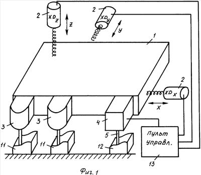При этом перемещение в горизонтальной плоскости (в плоскости станины) задают путем наклона щупа 5 вокруг точки пересечения поперечин 9 крестовины 8. При этом работает пара датчиков 7, находящихся на противоположных концах поперечин 9, расположенных в плоскости наклона щупа 5. Движение в вертикальном направлении задают путем продольного перемещения щупа 5. При этом работают все четыре датчика 7.