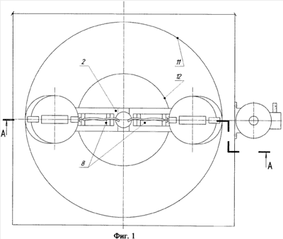 Устройство состоит из двух рабочих камер 1, расположенных по обе стороны от оси вращения водила 2, посаженых на вал 3 и располагающихся в подшипниковом узле 4. Рабочие камеры 1 жестко соединены с валом 3, который через синхронную муфту 5 соединен с фрикционным колесом 6. Соединенное с валом 3 фрикционное колесо 6 через типовую синхронную муфту 5 самоустанавливается (компенсируя угол наклона рабочих камер 1) по плоскости подшипникового узла 4, в котором для уменьшения сил трения, возникающих при вращении фрикционного колеса 6, имеется кольцевая проточка с находящимися в ней шариками 7. Камера меняет свой угол наклона за счет замены подшипникового узла 4 подшипниковым узлом 4′ другого исполнения с углом наклона вала 3, подбираемого экспериментально для каждой обрабатываемой группы деталей. Подшипниковый узел 4 совместно с рабочими камерами 1 может перемещаться по пазу водила 2 во время обработки деталей с помощью встроенных в водило пневмоцилиндров 8, шток которых перемещает их вдоль паза водила 2, обеспечивая тем самым, различные режимы обработки деталей. Для передачи вращения водилу 2 используется вал 9, жестко соединенный с водилом 2. Для подачи воздуха в пневмоцилиндры используется пневматическая муфта 10, соединенная с валом 9, вращающим водило 2. В валу 9 с этой же целью имеются два отверстия – одно для создания давления, а другое для сброса отработанного воздуха. С целью передачи вращения рабочим камерам 1 через фрикционные колеса 6 используются наружный копир 11 и внутренний копир 12.