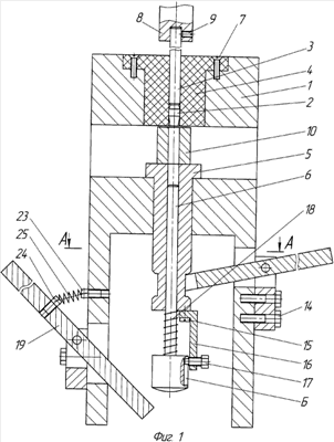 Устройство состоит из корпуса 1, дорна 2, толкателя 3 привода дорна, направляющей втулки 4, опорной втулки 5 и толкателя 6 возврата дорна. Втулка 4, выполненная из эластичного антифрикционного материала, жестко закреплена винтами 7 на корпусе 1. В отверстии этой втулки с натягом установлен дорн 2 и с зазором – толкатель 3 привода дорна. Этот толкатель закреплен в штоке 8 его привода винтом 9. Опорная втулка 5, на которую устанавливается обрабатываемая деталь 10, смонтирована в корпусе 1 с зазором, соосно с направляющей втулкой 4. В отверстии опорной втулки 5 размещен толкатель 6 возврата дорна. В нижней части этой втулки выполнена кольцевая выточка, с которой контактирует вилка 11, смонтированная на оси 12. Эта ось закреплена на кронштейне 13, привернутом к корпусу 1 винтами 14. К нижнему торцу опорной втулки 5 винтами 15 привернут кронштейн 16 с винтом 17, контактирующим с выполненным в головке толкателя 6 возврата дорна пазом Б и служащим для ограничения хода этого толкателя. Между головкой толкателя 6 возврата дорна и нижним торцом опорной втулки 5 размещена возвратная пружина 18. Для перемещения толкателя 6 возврата дорна вверх предназначен двуплечий рычаг 19, установленный на оси 20, которая смонтирована на кронштейне 21. Этот кронштейн привернут к корпусу 1 винтами 22. Между винтом 23, ввернутым в корпус 1, и винтом 24, ввернутым в рычаг 19, установлена возвратная пружина 25.