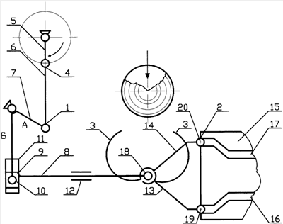 В интервалах прямого и обратного ходов палец 18, несущий выходные звенья с губками, перемещается по прямолинейной траектории – траектории движения толкателя 8.