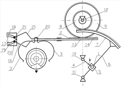 Исполнительный механизм 2 выполнен в виде рычажно-кулачкового механизма, он включает ведущее звено 13, выполненное в виде толкателя с закрепленной на нем зубчатой рейкой 14 для сопряжения с зубчатым колесом 9, выходные звенья 15 и 16 с губками для захвата изделий и неподвижный кулачок – копир 17 с фигурными пазами 18 и 19 для сопряжения с выходными звеньями. На свободном конце толкателя 13 закреплен палец 20 для шарнирной связи с выходными звеньями, а на свободных концах последних смонтированы ролики 21 и 22 для сопряжения с фигурными пазами 18 и 19 копира 17. Поворотное движение выходных звеньев на пальце 20 относительно толкателя 13 формируется рабочими профилями фигурных пазов 18 и 19.