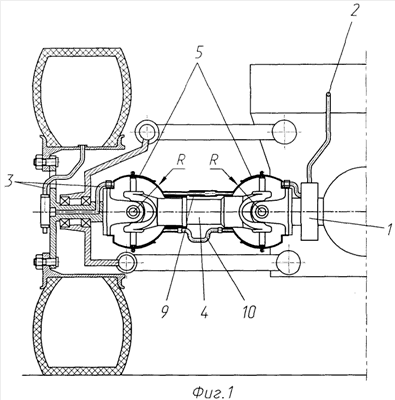 По второму варианту подача воздуха в шины осуществляется через крестовины 11, 12 карданного вала 4, выполненные с внутренними центральными воздушными каналами 13. Для этого два канала крестовины 12 связаны соединительными трубопроводами с источником рабочей среды, а два канала крестовины 11 через воздушный канал 14 и воздушный трубопровод 3 с шиной транспортного средства, а перпендикулярные им каналы обеих крестовин соединены между собой телескопическими компенсаторами 9 или гибкими трубопроводами 10, которые позволяют компенсировать изменение длины карданного вала.