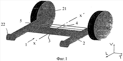 Как показано на фигуре 1, гибкая ось 1 составлена из двух продольных тяг 2, связанных поперечиной 3. Этот тип гибкой оси – симметричное подобие продольной оси Х-Х’, следовательно, левая часть этой оси будет описана в отношении фигуры 2.