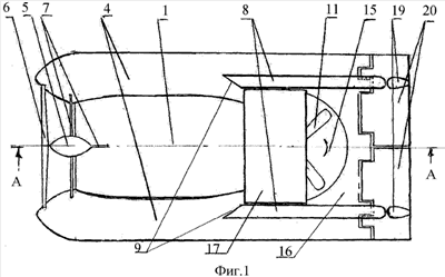 Внутри корпуса-фюзеляжа 1 установлены устройства (не показаны), управляющие скоростями вращения основного 5 и вспомогательного 10 двигателей, положением руля высоты 17, рулей по направлению 19, рулей по кренажу 20, положением в пространстве вспомогательного двигателя 10 с пропульсивным воздушным винтом 11 и перемещением в пространстве несущей его опорной траверсы 12, а также устройствами перемещения и фиксации 22.