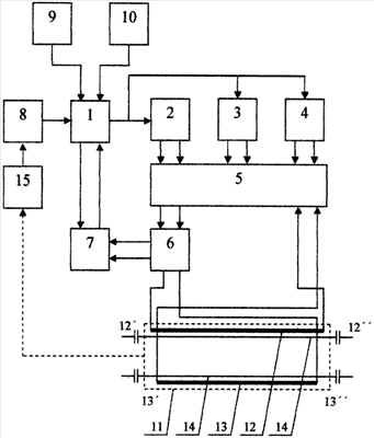 Входы генераторов 2, 3 и 4 подсоединены к первому выходу программного устройства 1, которое управляет их выходными параметрами. В генераторе АЛСН 2 управляемыми параметрами являются код огня, тип трансмиттера, несущая частота (25, 50 или 75 Гц), временные параметры импульсов (длительность импульсов, интервалы между ними и период), амплитуда тока; в генераторе АЛС-ЕН 3 управляемыми параметрами являются код сигнала и амплитуда тока; в генераторе помех 4 управляемыми параметрами являются спектральный состав помех и амплитуда помех. Кроме того, генератор 2 может формировать непрерывный немодулированный сигнал. Выходные параметры генераторов 2, 3 и 4 управляются независимо. Первый и второй выходы генератора АЛСН 2 подключены соответственно к первому и второму входам устройства сопряжения 5; первый и второй выходы генератора АЛС-ЕН 3 подсоединены соответственно к третьему и четвертому входам устройства сопряжения 5; первый и второй выходы генератора помех 4 подсоединены соответственно к пятому и шестому входам устройства сопряжения 5. Первый и второй выходы устройства сопряжения 5 подключены соответственно к первому и второму входам измерителя тока 6. Первый и второй выходы измерителя тока 6 связаны с проводами 12 и 13 шлейфа 11, причем первый выход измерителя тока 6 подсоединен к проводу 12 в точке 12′, а второй выход измерителя тока 6 подключен к проводу 13 в точке 13”. Противоположные концы проводов 12 и 13 (точки 12” и 13′) связаны соответственно с третьим и четвертым выходами устройства сопряжения 5. Третий и четвертый выходы измерителя тока 6 подсоединены соответственно к первому и второму входам цифрового устройства фильтрации 7, которое выполнено двухканальным, причем вход первого канала является первым входом устройства 7, а вход второго канала является вторым входом устройства 7. В первом канале производится фильтрация токового сигнала, текущего по одному из проводов шлейфа 11, а во втором канале производится фильтрация токового сигнала, текущего по другому проводу шлейфа 11. Каждый канал фильтрации может содержать, например, три фильтра, два из которых являются селективными и настроенными на частотный диапазон сигналов АЛСН (25, 50 или 75 Гц) и сигналов АЛС-ЕН (174,38 Гц), а третий фильтр является широкополосным и осуществляет фильтрацию суммарного сигнала, включая помехи. Настройка параметров фильтров производится с помощью управляющих сигналов, поступающих на вход управления устройства фильтрации 7 из программного устройства 1. Выход устройства фильтрации 7 соединен с третьим входом программного устройства 1. Первый вход-выход адаптера сопряжения 8 подсоединен к первому входу-выходу программного устройства 1, а первый вход адаптера 8 подключен к локомотивному оборудованию автоматической локомотивной сигнализации 15. Пульт местного управления 9 и пульт дистанционного управления 10 связаны соответственно с первым и вторым входами программного устройства 1.