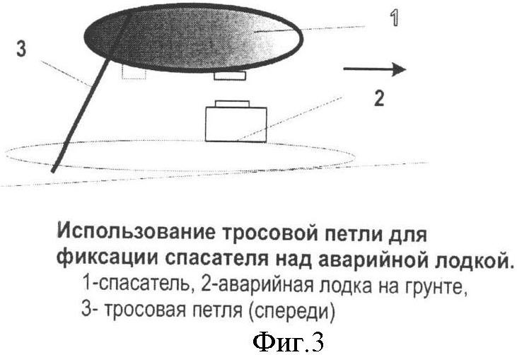 Все операции по спасению могут проводиться после предварительной рекогносцировки, во время которой определяется необходимое количество, размер и расположение фиксирующих тросов 10. После чего, в надводном положении, на лодке-спасателе закрепляются фиксирующие тросы и герметично устанавливается переходной отсек 6. Лодка – спасатель располагается над аварийной ПЛ. (При необходимости для установки спасателя над аварийной ПЛ может использоваться тросовая петля. см. ниже, фиг.3).