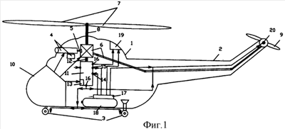 На фиг.1 представлен пример функциональной схемы одновинтового вертолета, а на фиг.2 – вертолета с двумя соосными винтами для осуществления данных вариантов способа, где позициями обозначены: