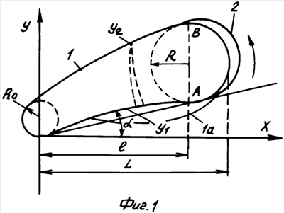 Для повышения подъемной силы несущего винта (фюзеляжа вертолета) задняя и передняя кромки лопасти (нижняя и верхняя поверхность фюзеляжа) образуются касанием двух парабол: У1=К1Х1/2; У2=2R0+K2X1/2, касающиеся окружности с радиусом R R0 (фиг.1, фиг.4), центр которой находится на расстоянии l 2/3L, где L – проекция длины лопасти (фюзеляжа) на координату Х. Изначально задают следующие величины: угол атаки  7о;