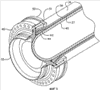 Фиг.4 представляет собой частичный вид в разрезе жесткого соединения двигателя 19 с задним фланцем 27 бака окислителя и задним днищем 30. Корпус 36 двигателя имеет кремниево-фенольную внутреннюю оболочку 37 толщиной приблизительно 0,25 см, и наружную обмотку 38 из углеродно-волоконного жгута толщиной 0,75 см. Твердое топливо 39 отливается в корпус, оставляя открытые участки вокруг осевой линии корпуса. Отливаемая под давлением головная изоляция 40 формируется перед твердым топливом и имеет выгнутый вперед конец 41, соответствующий сопрягаемому изгибу заднего конца днища 30. Передний конец корпуса 36 расширяется в наружном направлении для посадки на цилиндрический стальной клин 43 треугольного сечения и имеет переднюю поверхность 44 с уплотнением 45 с уплотнительным кольцом, посаженным на выступающий в наружном направлении цилиндрический фланец 46 на заднем днище 30.