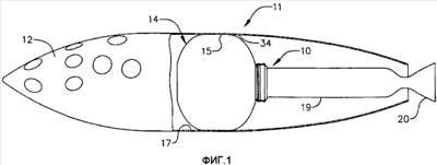 На Фиг.1 показана гибридная двигательная установка 10, установленная в фюзеляже 11 крылатого суборбитального космического летательного аппарата, частично показанного в разрезе и имеющего кабину 12 пилота. Основными элементами ракетной двигательной установки 10 являются бак 14 окислителя с вытянутой цилиндрической средней частью 15, прикрепляемой к внутренней поверхности 17 фюзеляжа, причем бак имеет заднее днище (как будет описано ниже), к которому прикрепляется цилиндрический двигатель 19, заканчивающийся соплом 20. Убирающиеся шасси, крыло космического летательного аппарата и хвостовое оперение не показаны на Фиг.1 в целях ясности.