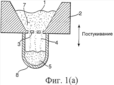 17. Способ по любому из пп.1-6, в котором по меньшей мере механическое воздействие на контейнер сообщает порошку импульсы в направлении от открытого конца контейнера внутрь него.