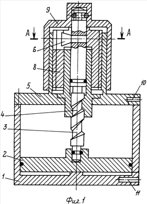 Для перемещения поршня 2 с штоком 3 и выходным элементом 9 вниз рабочая среда под давлением подается в подштоковую полость через канал 10, а подпоршневая полость через канал 11 соединяется с атмосферой. Поршень 2 начнет перемещаться вниз, шток 3, проворачиваясь по резьбе и упираясь в вертикальную поверхность паза, будет вращать также и винт 8 в обратном направлении. Все подвижные детали займут исходное положение.