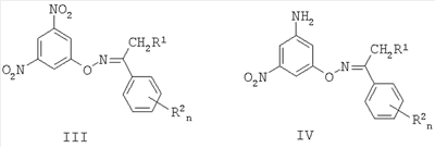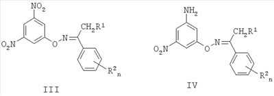 3. Способ получения соединений по п.1 или 2, заключающийся в том, что замещенные O-(3,5-динитрофенил)кетоксимы общей формулы III, где R1, R2 и n имеют вышеуказанные значения, обрабатывают гидразингидратом в алифатическом спирте при кипячении в присутствии соли железа и активированного угля, образующиеся при этом соответствующие O-(3-амино-5-нитрофенил)кетоксимы общей формулы IV, где R1, R2 и n имеют вышеуказанные значения, подвергают обработке смесью кислоты с алифатическим спиртом, при температуре кипения смеси: