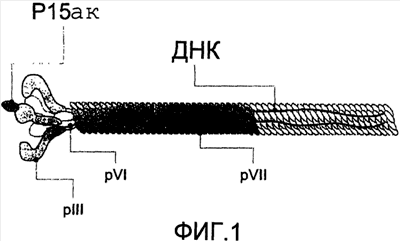 Фиг.1 схематично показывает положение 15-аминокислотного (ак) пептида, генетически слитого с белком pIII на поверхности нитевидного бактериофага М13.