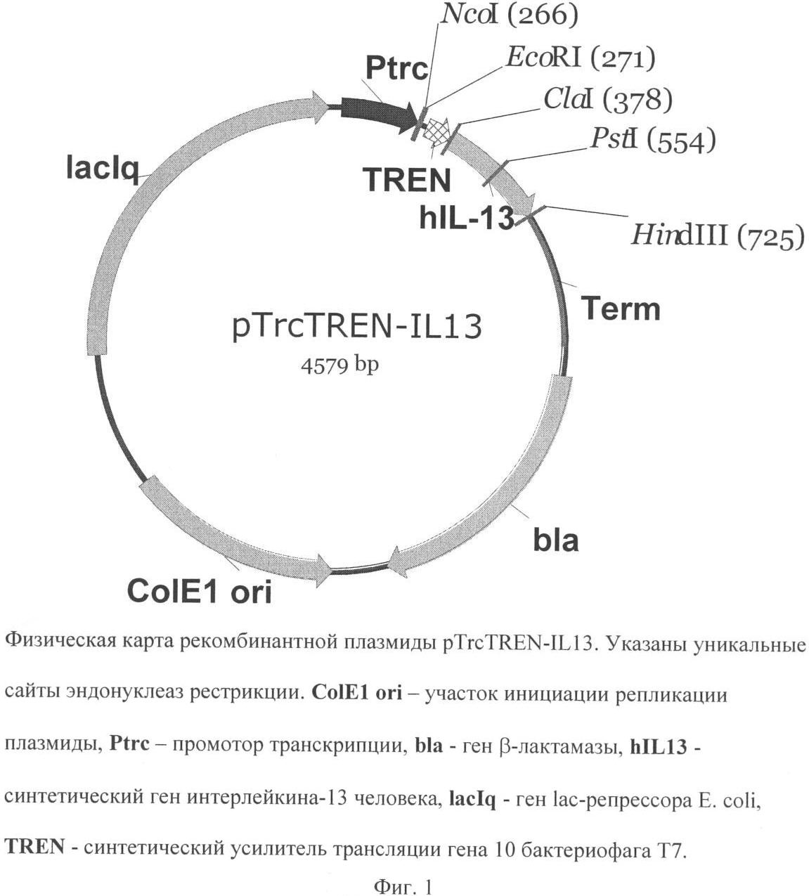 Рекомбинантная плазмидная ДНК pTrcTREN-IL13 кодирует индуцибельный синтез полипептида со свойствами интерлейкина-13 человека, а штамм Escherichia coli BL21(DE3)/pTrcTREN-IL13 обеспечивает синтез этого полипептида с уровнем экспрессии не ниже 15% суммарного клеточного белка. Индуцибельный высокий уровень синтеза целевого полипептида обеспечивается тем, что плазмида pTrcTREN-IL13 содержит trc-промотор Е. coli и синтетический усилитель трансляции гена 10 бактериофага Т7, а также оптимизацией 5′-концевой последовательности гена интерлейкина-13 человека.