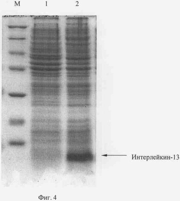 Рекомбинантной плазмидной ДНК pTrcTREN-IL13 трансформируют компетентные клетки Escherichia coli BL21(DE3) (Novagen) и получают штамм-продуцент полипептида со свойствами интерлейкина-13 человека. Клетки Е. coli В L21(DE3)/pTrcTREN-IL13 выращивают при 37°С в 20 мл жидкой среды LB, содержащей 125 мкг/мл ампициллина, в течение 16 ч на качалке при 175 об/мин. Полученную ночную культуру в объеме 200 мкл переносят в 10 мл жидкой среды LB (разбавление до оптической плотности 0.1-0.15 при длине волны 560 нм), содержащей 125 мкг/мл ампициллина, и выращивают до оптической плотности 0,7 (длина волны 560 нм) при 37°С при 185 об/мин. Добавляют ИПТГ до конечной концентрации 0,05 и 1 мМ, после чего клетки выращивают в течение 3 часов. Отбирают пробу культуры в количестве 1 оптическая единица (длина волны 560 нм) и центрифугируют 5 мин при скорости 6000 об/мин. Осажденные клетки суспендируют в 100 мкл буфера, содержащего 125 мМ трис-HCl, рН 6,8, 20% глицерин, 3% додецилсульфат натрия, 3% меркаптоэтанол, 0,005% бромфеноловый синий, инкубируют 10 мин в кипящей водяной бане, образцы объемом 10 мкл анализируют электрофорезом в 15% полиакриламидном геле с додецилсульфатом натрия. Гель окрашивают Кумасси R-250 (фиг.4), сканируют и рассчитывают процентное содержание рекомбинантного белка в лизатах с использованием программы Scion Image (Scion Corp., США). По данным сканирования полипептид интерлейкин-13 человека составляет 15% от общего клеточного белка при индукции 0,05 мМ ИПТГ. На фиг.4 представлена электрофореграмма лизатов клеток штамма-реципиента Е. coli BL21(DE3) (дорожка 1), штамма-продуцента Е. coli BL21(DE3)/pTrcTREN-IL13 (дорожка 2) в 15%-ном полиакриламидном геле (М – белковые маркеры молекулярной массы; стрелкой указан полипептид ИЛ-13).