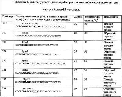 По 2,5 мкг полученных в результате ПЦР фрагментов 1 и 2 (длиной 0,096 и 0,067 т.п.о. обрабатывают 10 ед. рестриктазы Ара I (Fermentas, Литва) 1,5 ч при 37°С в 24 мкл 0.5-кратного калий-глутаматного буфера КОВ, из полученных гидролизатов выделяют фрагменты ДНК длиной 0,091 и 0,058 т.п.о. переносом на DEAE – мембрану NA-45 (Schleicher & Schuell, Германия) из 2%-ного агарозного геля и сшивают при помощи лигазной реакции в течение 4 ч при 12°С в 15 мкл раствора, содержащего 40 мМ Трис-HCl (рН 7,8), 10 мМ MgCl2, 10 мМ дитиотреитола, 0,5 мМ аденозинтрифосфата и 3 ед. Вейса Т4 ДНК-лигазы (Fermentas, Литва). После этого с целью обогащения реакционной смеси полученной кДНК первого и второго экзонов гена интерлейкина-13 человека осуществляют амплификацию следующим образом: к 2 мкл лигазной смеси прибавляют по 100 пмоль прямого и обратного праймеров (326 и 329, состав праймеров см. Таблица), 8 мкл смеси, содержащей 2,5 мМ каждого из дезоксинуклеозидтрифосфатов, 10 мкл 10-кратного буфера (100 мМ трис-HCl, рН 8,8, 500 мМ KCl, 15 мМ MgCl2), 2 ед. Taq ДНК-полимеразы (Fermentas, Литва) и воду до 100 мкл. Полимеразную цепную реакцию (ПЦР) проводят в следующем режиме: денатурация – 1 мин, 94°С; отжиг – 30 сек, 52°С; достройка – 40 сек, 72°С; количество циклов – 35. Из полученной смеси продуктов реакции выделяют фрагмент ДНК длиной 0,149 т.п.о. переносом на DEAE-мембрану NA-45 (Schleicher & Schuell, Германия) из 1,5%-ного агарозного геля. 2,5 мкг полученного фрагмента 1-2 обрабатывают 10 ед. рестриктазы EcoRI и 10 ед. рестриктазы KpnI (Fermentas, Литва) 1,5 ч при 37°С в 24 мкл 0.5-кратного калий-глутаматного буфера КОВ, из полученного гидролизата выделяют фрагмент ДНК длиной 0,139 т.п.о. переносом на DEAE-мембрану NA-45 (Schleicher & Schuell, Германия) из 1,5%-ного агарозного геля.