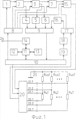 В предлагаемом устройстве может быть установлено несколько блоков 20 коммутаторов, например, 8, тогда количество контролируемых цепей составит 56. В этом случае, например, выходы восьмого блока 20 коммутаторов, так же, как и первого, показанного на фиг.1, будут использованы в качестве измерительных выходов 21.50-21.56 (не показаны) устройства, а его входы – в качестве измерительных входов 22.50-22.56 (не показаны) устройства. Первые входы всех используемых в устройстве блоков 20 коммутаторов, так же, как и первого, показанного на фиг.1, подключены к выходу переключателя 15 режимов, первые выходы – к второму входу блока 17 эталонного резистора сопротивления цепи, а управляющие входы – к пятому выходу локальной шины 10.