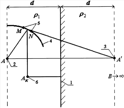 Схема включает в себя раздел двух сред 1 (с удельными сопротивлениями 1 и 2), точечный источник 2 (А), второй точечный источник (В) условно отнесен в бесконечность, фиктивный источник 3, выбранная эквипотенциаль 4, измерительные электроды 5 и компенсационный источник 6.