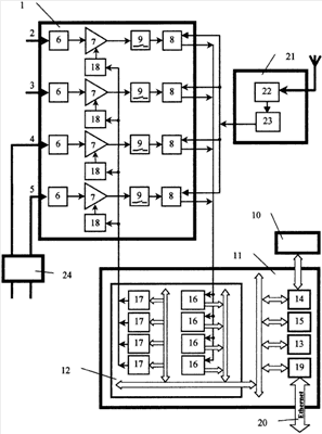 На входы 2 и 3 модуля 1 регистратора поступают сигналы с выхода датчиков составляющих магнитного поля, а на входы 4 и 5 модуля 1 поступают сигналы с выхода предусилителя 24, на входы которого поступают сигналы с выхода датчиков составляющих электрического поля. В каждом канале модуля 1 входной сигнал после прохождения через фильтр низких частот 6 усиливается усилителем 7 и преобразуется в цифровую форму в аналого-цифровом преобразователе 8. При наличии вблизи точки наблюдения промышленных помех осуществляется дополнительная фильтрация измеряемых сигналов с помощью фильтров 9, которые включаются, в частности, путем задания оператором соответствующего режима с помощью клавиатуры.