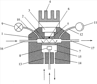 Контактный датчик температуры 6 выполнен с возможностью переключения для измерения температур конденсационного зеркала 5 или конденсационного зеркала 7. Для достижения более низких температур термобатарея 3 выполнена трехкаскадной. Вход и выход световодов 10, 12 направлены под углом к конденсационному зеркалу 7, обеспечивающим многократное отражение световых лучей от рабочих поверхностей конденсационных зеркал 5, 7, например, не менее пяти отражений. Источник световых лучей 9, световод 10, конденсационное зеркало 7, конденсационное зеркало 5, световод 12, фотоприемник 11 и электрическая схема (на чертеже не показана) представляет собой детектор точки росы.