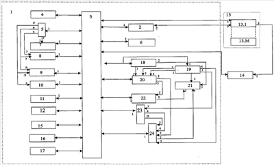 На чертеже представлена функциональная схема процессингового центра для проведения лотереи, где процессинговый центр лотереи – 1, блок подготовки и тиражирования лотерейных билетов – 2, интерфейс – 3, блок ввода/вывода информации – 4, блок формирования учетных данных – 5, блок памяти – 6, первый блок формирования игровых данных – 7, первый генератор случайных чисел – 8, второй генератор случайных чисел – 9, третий генератор случайных чисел – 10, первый блок формирования защитных данных – 11, второй блок формирования защитных – 12, терминалы реализации лотерейных билетов – 13.1-13.М, банк – 14, блок расчета призового фонда – 15, таймер – 16, блок сортировки – 17, счетчик – 18, блок установки условий игры – 19, первый блок проведения розыгрыша – 20, блок сигнализации – 21, первый блок сравнения – 22, второй блок проведения розыгрыша – 23, второй блок сравнения – 24.