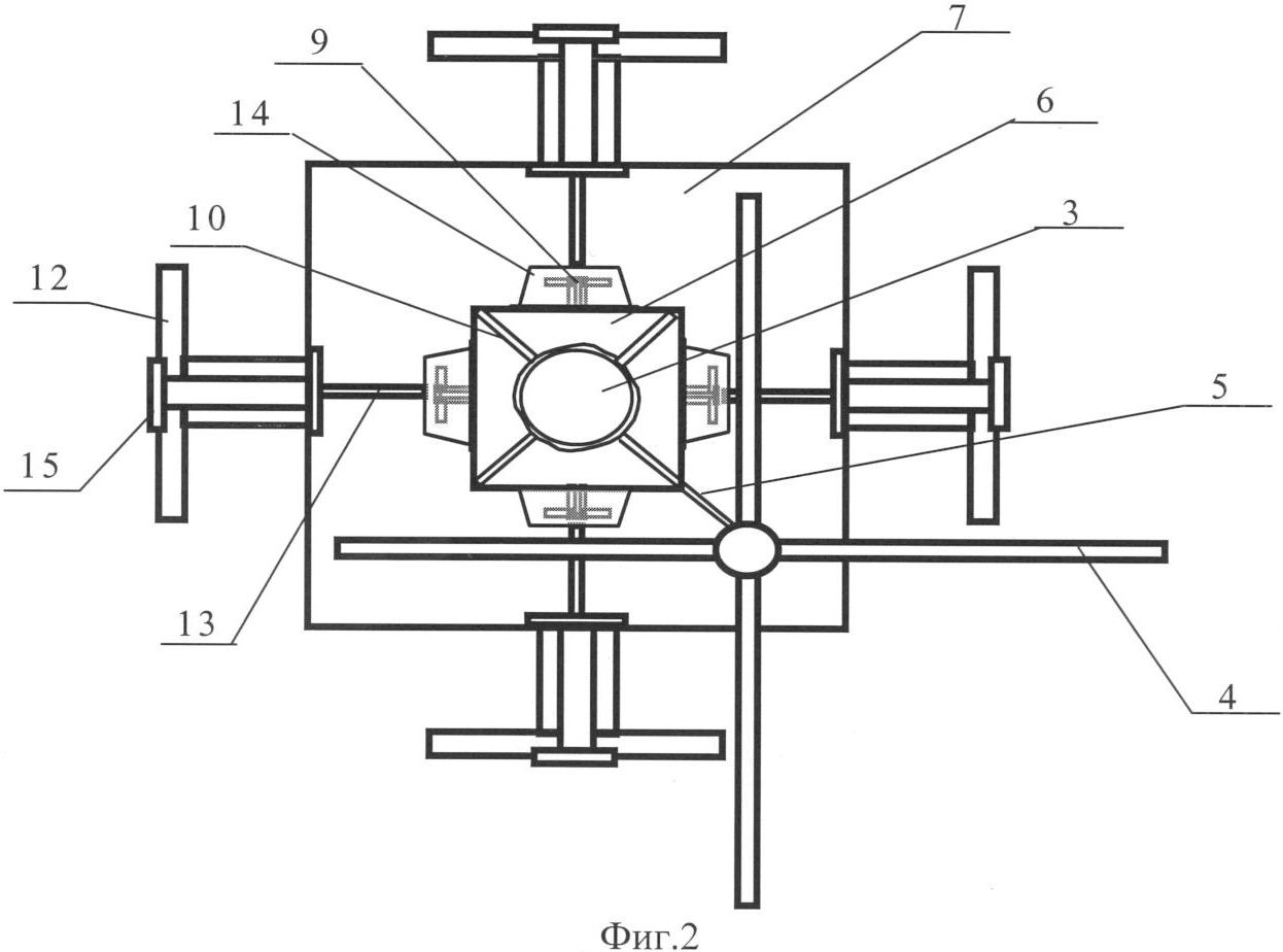 Антенная система (фиг.1) установлена на телевизионной башне ферменной конструкции 1, с площадкой 2, на которой установлена труба 3 для размещения антенн. Турникетная зигзагообразная антенна 4 установлена на трубе с помощью кронштейнов 5, панельная антенна ДМВ диапазона 6, панельная антенна III диапазона 7, решетчатая рама панельной антенны ДМВ диапазона 8, на которой установлены излучатели 9, закрепленная на трубе при помощи кронштейнов 10, решетчатая рама панельной антенны III диапазона 11, на которой установлены излучатели 12, закрепленная на трубе при помощи кронштейнов 13. Излучатели панельной антенны ДМВ диапазона (фиг.2) закрыты индивидуальными защитными радиопрозрачными чехлами 14, а узлы запитки излучателей панельной антенны III диапазона – индивидуальными защитными радиопрозрачными чехлами 15. В такой конструктивной проработке, представляющей собой многоканальную антенную систему, удалось вместо одной турникетной антенны установить три широкополосных антенны.