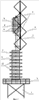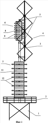 Известны конструкции радиотелевизионных башен, описанных в книге Савицкого Г.А. “Антенные устройства”, М., “Связь”, 1961 г. На типовых башнях в верхней ее части расположена призма, предназначенная для размещения антенн, на ней установлены панельные вибраторные антенны I, или II, или III частотных диапазонов. Однако размеров призмы по высоте недостаточно для установки дополнительных антенн для обслуживания возросших потоков информации. При этом конструкция башни вызывает искажение формы диаграммы направленности (ДН) в горизонтальной плоскости. Вследствие затенения возникает интерференция волн, излучаемых антенной и волн, отраженных от башни, что приводит к появлению в ДН направлений с недостаточным уровнем напряженности поля.