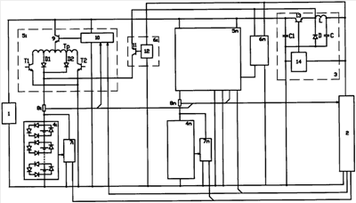 Схемы управления: 10-зарядных преобразователей 51-5n, 12-разрядных преобразователей 61-6n, 14 – преобразователя напряжения 3, выполнены в виде широтно-импульсных модуляторов, входом подключенных к шинам стабилизируемого напряжения. Схемы управления 10-зарядных преобразователей 51-5n дополнительно связаны с измерительными шунтами 81-8n и нагрузкой 2.