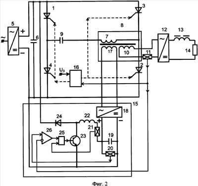 Схема прототипа приведена на фиг.1 и содержит мостовой тиристорный инвертор 1÷4, подключенный диагональю постоянного тока к источнику питания 5, шунтированному фильтровым конденсатором 6. В диагональ переменного тока упомянутого тиристорного инвертора 1÷4 включена первичная обмотка 7 трансформатора 8 последовательно с коммутирующим конденсатором 9. Вторичная обмотка последовательно с датчиком тока 11 подключена к диодному выпрямителю 12, выводы постоянного тока которого подключены последовательно с дросселем 13 к нагрузке 14. Кроме того, силовая часть устройства содержит блок расширения диапазона регулирования 15 в составе последовательной цепи из двух диодов 16, 17 и двух тиристоров 18, 19, причем катод диода 16 подключен к плюсу источника питания 5, а анод диода 17 подключен к минусу источника питания 5. Тиристоры 18, 19 включены согласно-последовательно в проводящем по отношению к источнику питания 5 направлении и общей точкой связаны с общей точкой упомянутых коммутирующего конденсатора 9 и первичной обмотки 7 трансформатора 8. Свободные выводы тиристоров 18, 19 объединены с одноименными выводами диодов 16, 17, причем к общим точкам диода 16 и тиристора 18, а также диода 17 и тиристора 19 подключена индуктивность 20.