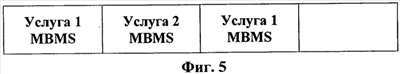 Фиг.5 иллюстрирует способ передачи мультимедийной широковещательной/многоадресной услуги (MBMS) в соответствии с настоящим изобретением. Множество услуг фонового типа («услуга 1 MBMS» и «услуга 2 MBMS») передаются по одному каналу с использованием способа временного мультиплексирования. Здесь «один канал» означает транспортный или физический канал.