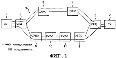 Фиг.1 является упрощенной схемой одного вида системы связи. Структура фиг.1 основана на архитектуре системы мобильной связи УСМС (универсальная система мобильной связи) (UMTS – Universal Mobile Telecommunications System) третьего поколения (3G). Система по фиг.1 включает в себя два пользовательских устройства или терминала (ПУ) (UE) 1, 2, которые выполнены с возможностью осуществления связи посредством сети 3. Каждый из терминалов связывается с сетью по радио и получает доступ к сети 3 через сеть 4, 5 радиодоступа (СРД) (RAN). Сеть 3 обеспечивает два типа связи между терминалами. Соединения с коммутацией каналов, например, для речевой связи происходят между сетями 4, 5 радиодоступа через центры 6, 7 коммутации мобильной связи (ЦКМС) (Mobile Switching Centre – MSC). Соединения с коммутацией пакетов, например, для передачи данных происходят между сетями радиодоступа через обслуживающий узел 8, 9 поддержки GPRS (ОУПО) (SGSN – Serving GPRS Support Node) и шлюзовой узел 10, 11 поддержки GPRS (ШУПО) (GGSN – Gateway GPRS Support Node) (GPRS-общие услуги пакетной радиосвязи).