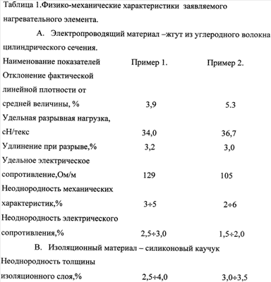 Способ получения нагревательного элемента, содержащий формирование заготовки для получения электропроводящего материала скручиванием жгута из полимерных нитей, обработку заготовки водным раствором катализатора, ее сушку с последующим термоокислением при 200÷300°С, карбонизацией при 1500÷2000°С и графитацией при 2000÷3000°С, формирование слоя изоляционного материала, отличающийся тем, что обработка заготовки для получения электропроводящего материала водным раствором катализатора производится при давлении (2÷5)105 Па и температуре 20÷50°С, а формирование слоя изоляционного материала – экструзией силиконового каучука на электропроводящий материал при температуре 150÷200°С и давлении (2÷3)107 Па.