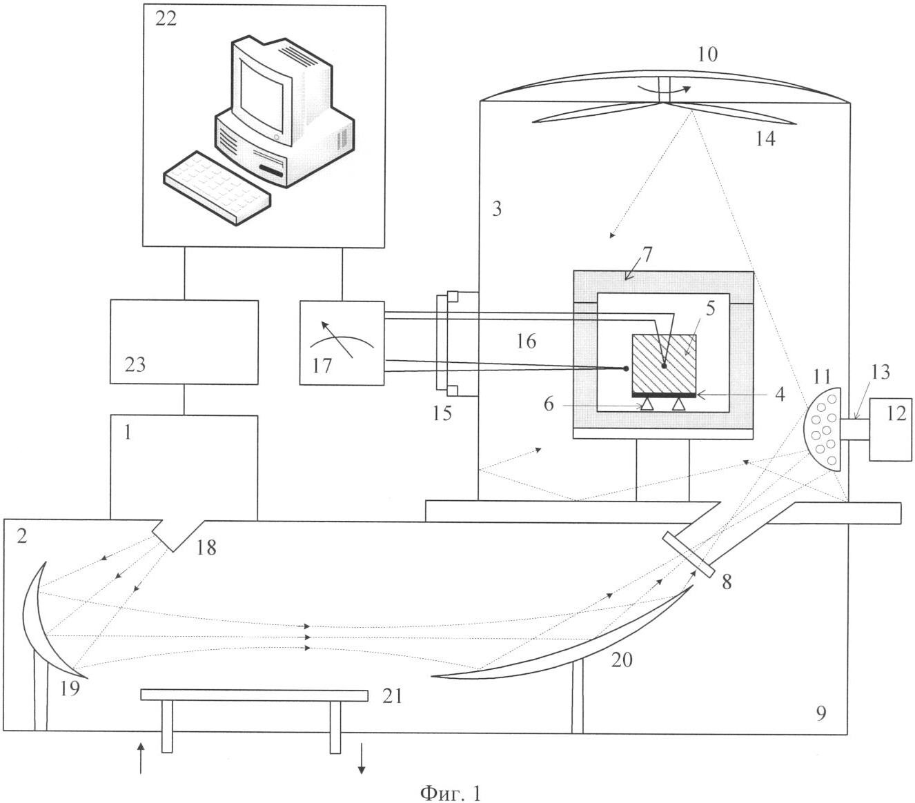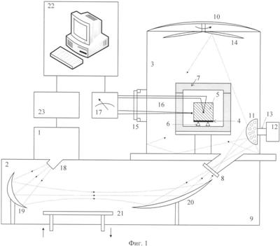 В частном случае источник 1 микроволнового излучения изготовлен с выходной мощностью до 10 кВт на частоте 30 ГГц с регулируемой выходной мощностью. Источником 1 микроволнового излучения может быть гиротрон, например, модель GCGT-30/10/CW, изготавливаемый компанией ЗАО НПП ГИКОМ, Россия. Микроволновая мощность передается через специально сконструированную квазиоптическую линию передачи 2 к микроволновой камере 3 для спекания. Излучатель 18 и первое зеркало 19 линии передачи 2 трансформируют рабочую моду Н02 гиротрона в гауссовый волновой пучок и направляют волновой пучок на второе зеркало 20, которое фокусирует волновой пучок на входном окне 8 камеры 3. Линия передачи 2 включает в себя также водоохлаждаемую металлическую пластину 21, покрытую керамическим слоем, который поглощает микроволновое излучение, отраженное от камеры 3 для спекания. Все компоненты линии передачи 2 помещены в закрытый металлический кожух 9. Микроволновая мощность, поглощаемая в пластине 21, измеряется калориметрическим измерителем мощности.