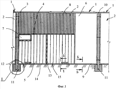Для обеспечения дополнительной прочности и надежности в стеновой панели 2 профильная рама 3 каждой стеновой панели может иметь основание и верхнюю часть, выполненные из швеллера, при этом боковые части могут быть выполнены из профиля замкнутого сечения, в частности сечения квадратной, прямоугольной, круглой формы, или другой формы, целесообразной для данного варианта выполнения (см. Фиг.5).
