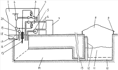 Реле уровня жидкого навоза 15, загрузочный клапан 16, навозный лоток 17, фильтр-сетка 18, реле давления воздуха 19 в продувочном котле 14 и датчик 20 положения загрузочного клапана 16 установлены в свинарнике.