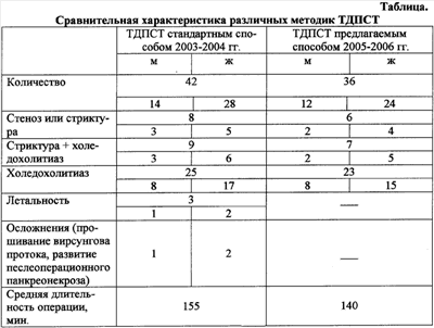 Данный способ трансдуоденальной папиллосфинктеротомии позволяет устранить интраоперационные и послеоперационные осложнения, в частности: прошивание вирсунгова протока с развитием послеоперационного панкреатита, повторные стриктуры БДС и летальность. Способ позволяет сократить время выполнения оперативного вмешательства. Методика проста, не требует больших материальных затрат. Оценить эффективность ее применения можно с помощью следующих данных (см. табл.).