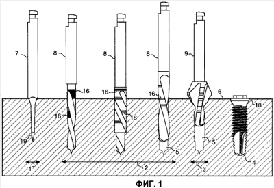На фиг.1 представлен пример способа низкооборотного фрезерования, где способ применен для образования полости или ячейки (5) в ткани (6) пациента. В данном конкретном случае ткань представляет собой верхнюю челюсть, и полость образуют для вмещения верхнечелюстного зубного имплантата (4). В данном способе кортикальный слой или самую твердую наружную секцию кости (6) просверливают на начальном этапе (1). За этим следует промежуточный этап (2) фрезерования, на котором образуют полость (5). И, наконец, способ завершают этапом (3) зенковки, на котором полость (5) расширяют для вмещения головки (18) верхнечелюстного зубного имплантата (4).