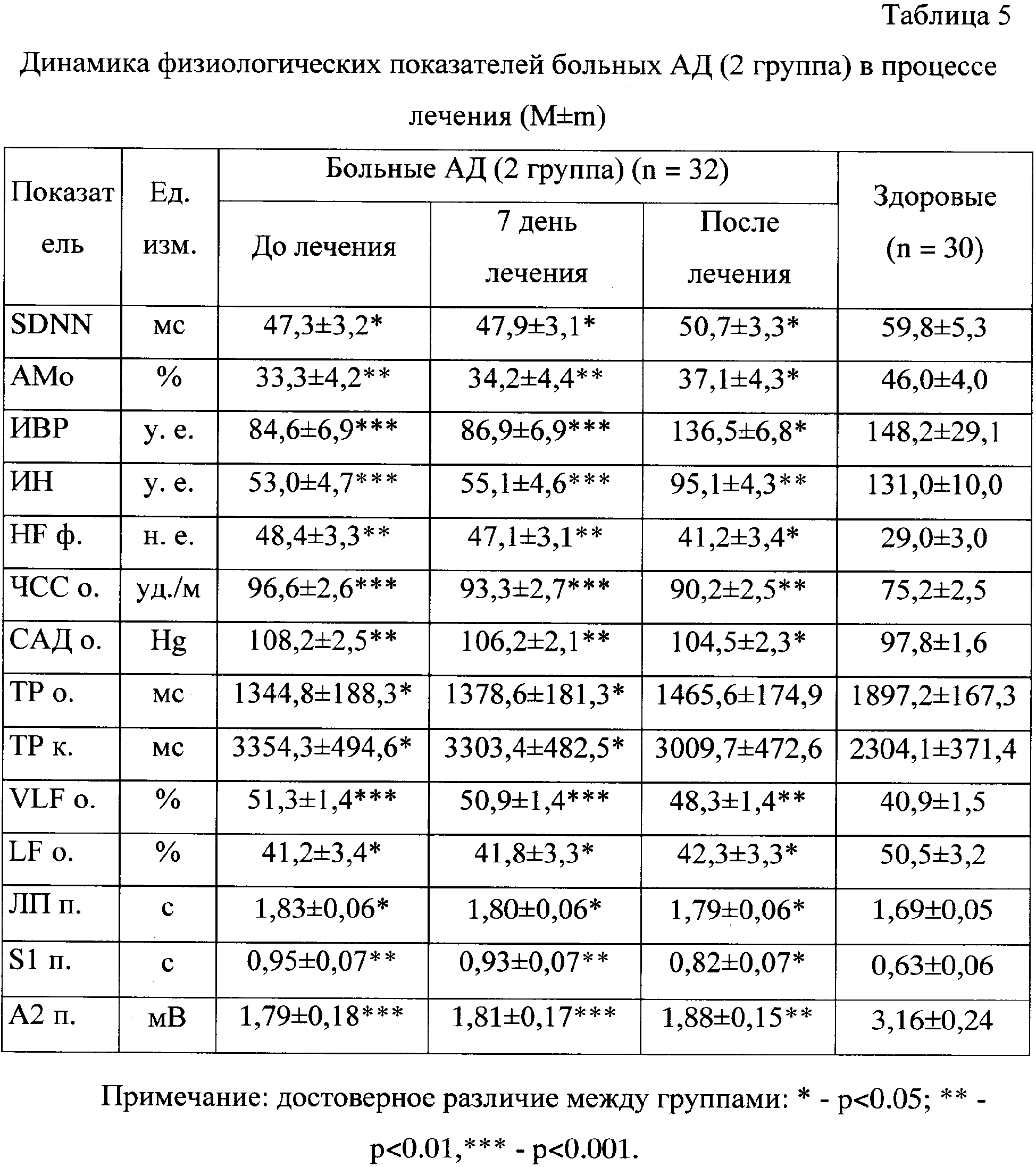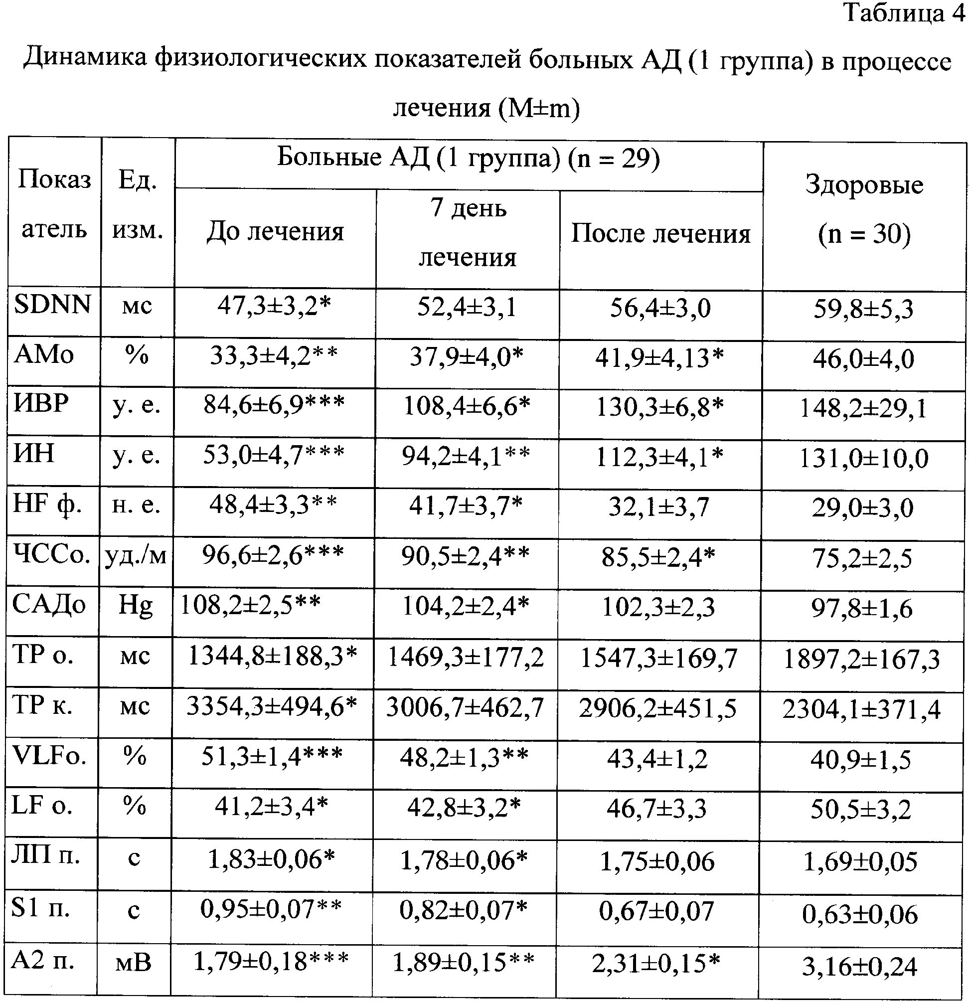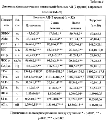 В процессе лечения наблюдается положительная динамика состояния вегетативной нервной системы больных АД в обеих группах, но более выраженная в группе больных, получавших комплексное лечение. Через 7 дней и после лечения достоверно изменяются показатели вариационной пульсометрии, спектрального анализа ритма сердца, вызванного кожного вегетативного потенциала. Характер этих изменений свидетельствует о нормализации состояния вегетативной нервной системы – снижении повышенных центральных эрготропных и гуморальных влияний и парасимпатической активности (табл.4, табл.5).