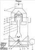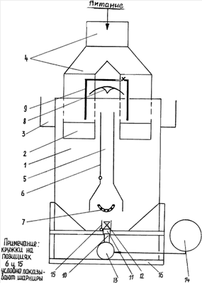 Для защиты сопел Лаваля от износа по их бокам устанавливаются вертикально металлические пластины 15, причем одна из пластин может устанавливаться на шарнире для облегчения доступа при обслуживании сопел. Нижняя часть вертикальной перегородки 6, находящейся против пластины с шарниром, также соединяется с верхней ее частью на шарнире. Эта перегородка делается составной. Пирамидальная форма окончания ванны 1 облегчает поступление твердых частиц пульпы в аэролифт 5 через зазор между днищем ванны и вертикальными перегородками.