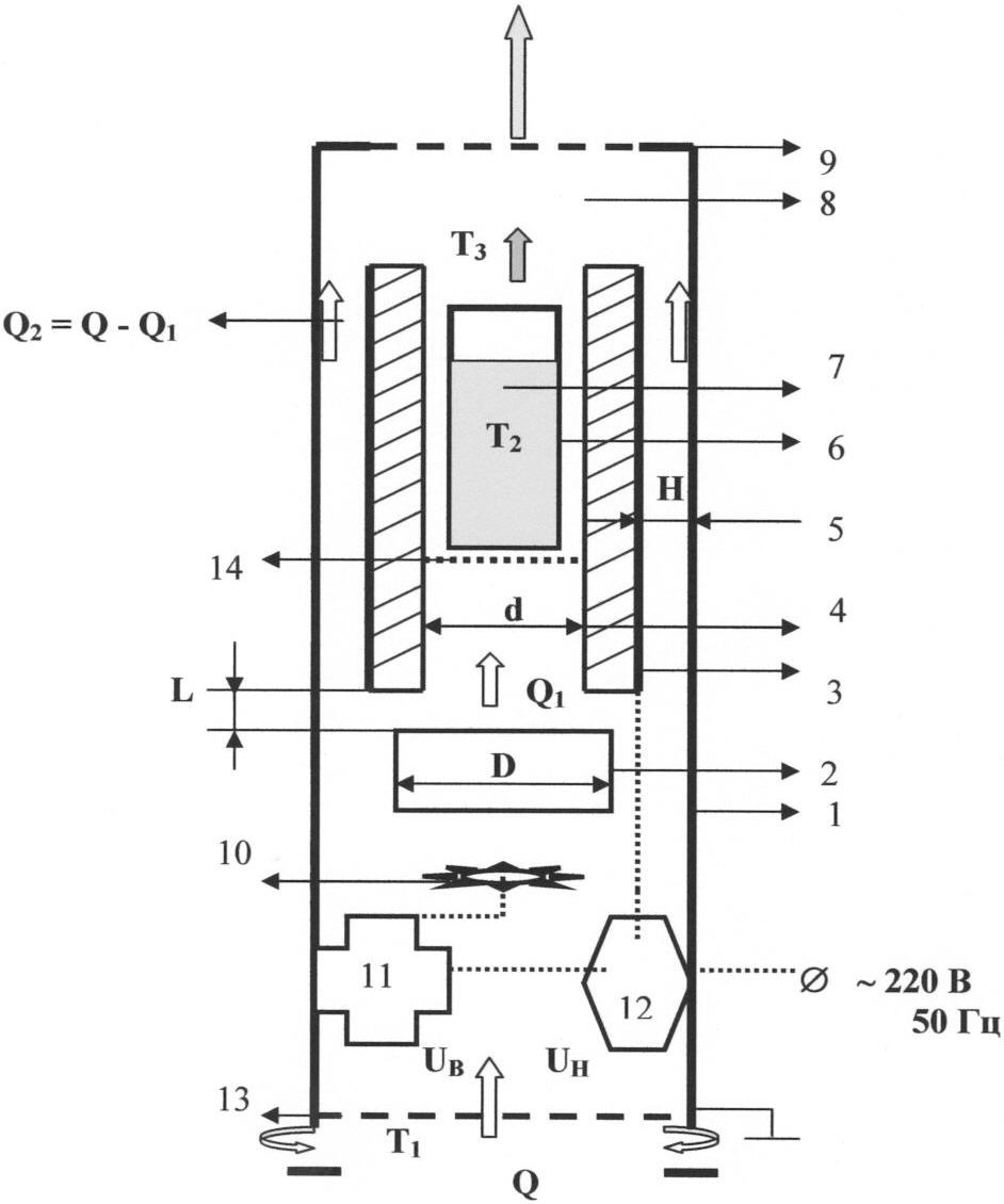 На схеме приняты также следующие обозначения: D – диаметр цилиндрического тигля 2; d – диаметр трубчатого канала 4; Н – ширина кольцевого зазора 5; L=(0,2-0,5)d – расстояние между цилиндрическим тиглем 2 и трубчатым каналом 4; Q=Q1+Q2 – объемный расход атмосферного воздуха, подаваемый вентилятором 10 в корпус 1 через сетку 13; Q1 – объемный расход воздушного потока в трубчатый канал 4; Q2 – дополнительный объемный расход воздушного потока через кольцевой зазор 5 для теплосъема и последующего охлаждения с турбулентным перемешиванием и одновременным разбавлением аэрозольного потока Q1; T1 – температура воздушного потока на входе в цилиндрический корпус 1; Т2 – температура в центре химически инертного реактора; Т3 – температура аэрозольного потока на выходе из реактора 6; UB – напряжение питания вентилятора, UH – напряжение питания электропечи.